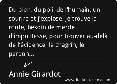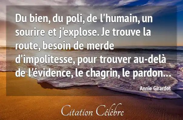 Du bien, du poli, de l'humain, un sourire et j'explose. Je trouve la route, besoin de merde d'impolitesse, pour trouver au-delà de l'évidence, le chagrin, le pardon...