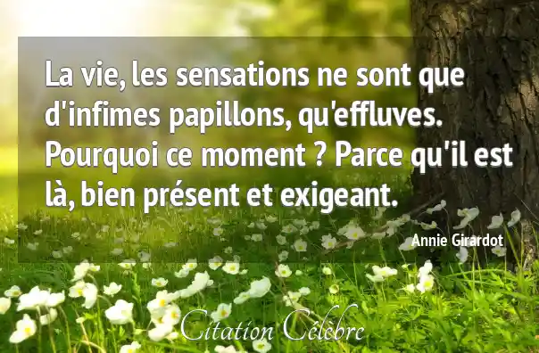 La vie, les sensations ne sont que d'infimes papillons, qu'effluves. Pourquoi ce moment ? Parce qu'il est là, bien présent et exigeant.