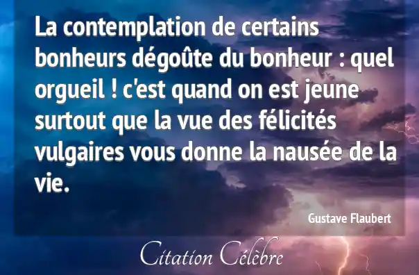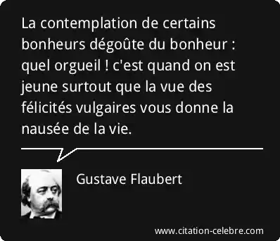 La contemplation de certains bonheurs dégoûte du bonheur : quel orgueil ! c'est quand on est jeune surtout que la vue des félicités vulgaires vous donne la nausée de la vie.