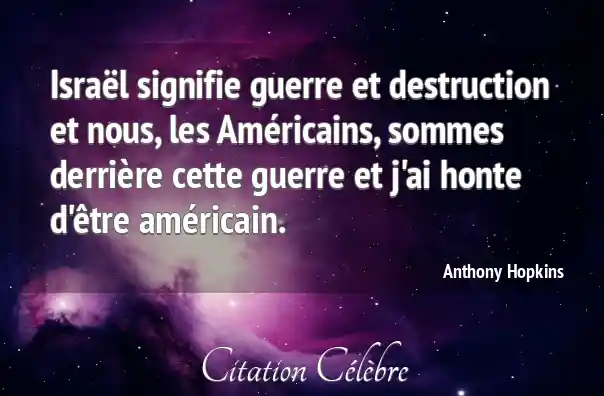 Attention : Des recherches approfondies indiquent que cette citation est largement attribuée à tort à l'acteur Anthony Hopkins sur les réseaux sociaux et sur certains sites. Il n'existe aucune source fiable ou vérifiable (interview, conférence de presse, article de journal, etc.) confirmant qu'il ait réellement prononcé ou écrit ces mots. Il est crucial d'indiquer à vos lecteurs que cette affirmation est très probablement une fausse attribution ou une désinformation circulant sur internet.