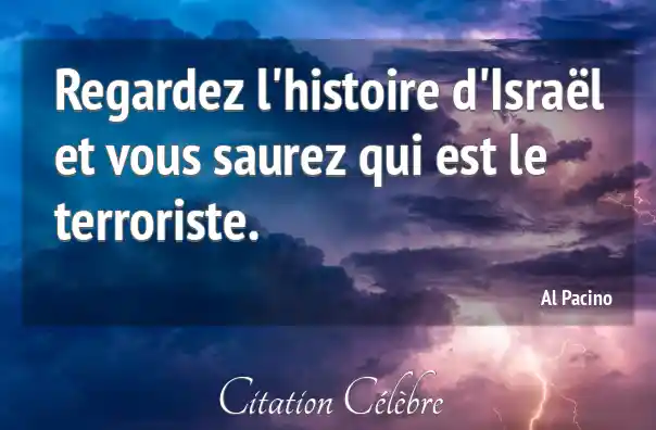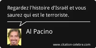 Cette citation, attribuée à Al Pacino, invite l'internaute à remettre en question la définition courante du terme «terroriste» dans le contexte du conflit israélo-palestinien. Elle suggère que si l'on examine attentivement l'histoire des actions et de l'établissement d'Israël, cela pourrait mener à une conclusion surprenante ou controversée quant à l'identité réelle de l'entité ou du groupe qui mérite cette appellation, renversant ainsi les perceptions traditionnelles.