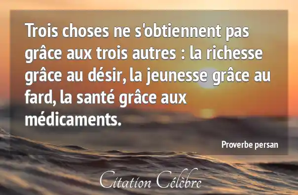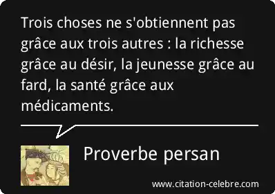 Trois choses ne s'obtiennent pas grâce aux trois autres : la richesse grâce au désir, la jeunesse grâce au fard, la santé grâce aux médicaments.