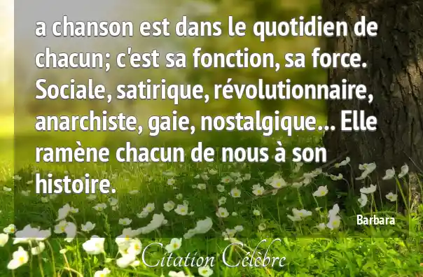 a chanson est dans le quotidien de chacun; c'est sa fonction, sa force. Sociale, satirique, révolutionnaire, anarchiste, gaie, nostalgique... Elle ramène chacun de nous à son histoire.