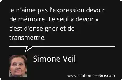 Cette citation de Simone Veil exprime son aversion pour l'expression « devoir de mémoire ». Pour elle, le seul impératif moral et social n'est pas un vague « devoir » ressenti, mais l'action concrète et volontaire d'enseigner et de transmettre les événements du passé, notamment les heures sombres de l'Histoire comme la Shoah dont elle fut victime. Elle souligne que la responsabilité réside dans l'acte d'éducation et de partage du savoir, garantissant que les leçons du passé ne soient pas oubliées, au lieu d'une obligation morale imposée et potentiellement stérile.