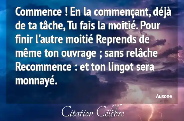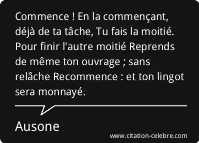 Commence ! En la commençant, déjà de ta tâche, Tu fais la moitié. Pour finir l'autre moitié Reprends de même ton ouvrage ; sans relâche Recommence : et ton lingot sera monnayé.