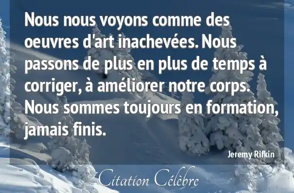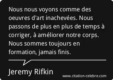 Nous nous voyons comme des oeuvres d'art inachevées. Nous passons de plus en plus de temps à corriger, à améliorer notre corps. Nous sommes toujours en formation, jamais finis.