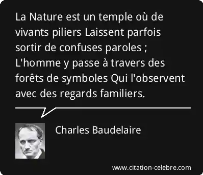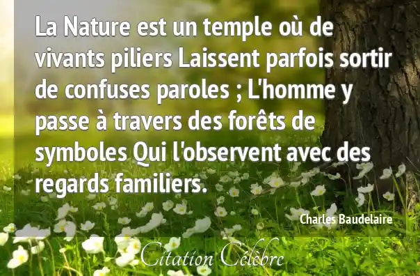 La Nature est un temple où de vivants piliers Laissent parfois sortir de confuses paroles ; L'homme y passe à travers des forêts de symboles Qui l'observent avec des regards familiers.