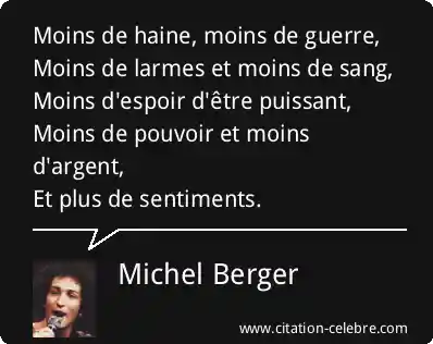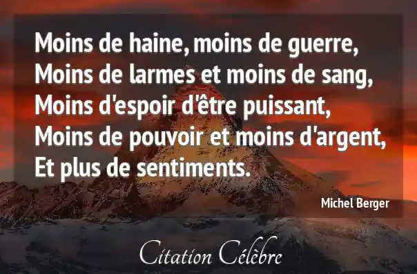 Moins de haine, moins de guerre, Moins de larmes et moins de sang, Moins d'espoir d'être puissant, Moins de pouvoir et moins d'argent, Et plus de sentiments.
