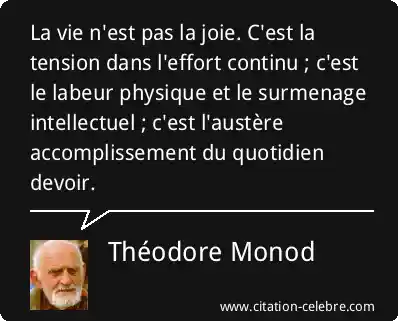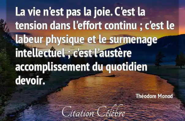 La vie n'est pas la joie. C'est la tension dans l'effort continu ; c'est le labeur physique et le surmenage intellectuel ; c'est l'austère accomplissement du quotidien devoir.