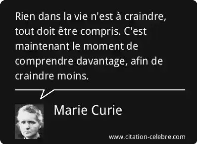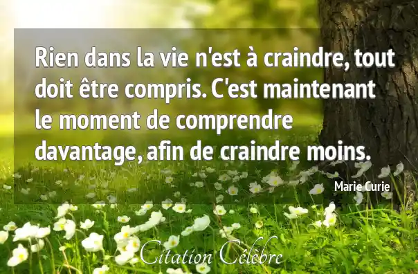 Style : La citation est caractérisée par un style direct, aphoristique et didactique. Elle est construite sur une structure de parallélisme et d'opposition simple (craindre/comprendre) qui en facilite la mémorisation et l'impact.