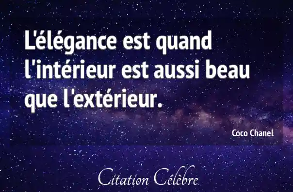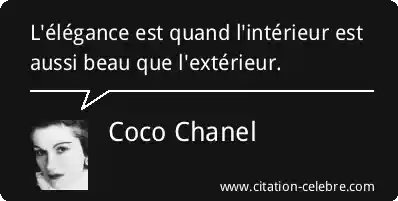 Cette célèbre formule de Coco Chanel définit l’élégance comme une harmonie profonde entre l'apparence extérieure et la richesse intérieure d'une personne. Il ne s'agit pas seulement de la beauté des vêtements ou de la prestance physique, mais de la congruence entre ce que l'on montre (l'extérieur) et ce que l'on est vraiment (l'intérieur : les valeurs, la personnalité, l'esprit).