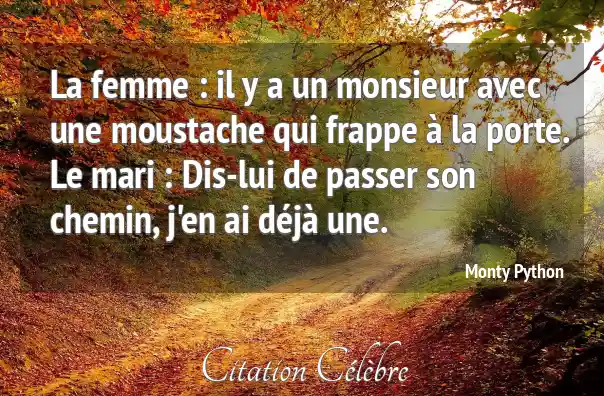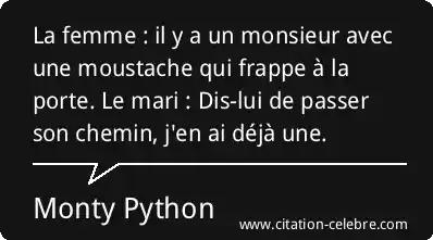 La femme : il y a un monsieur avec une moustache qui frappe à la porte. Le mari : Dis-lui de passer son chemin, j'en ai déjà une.