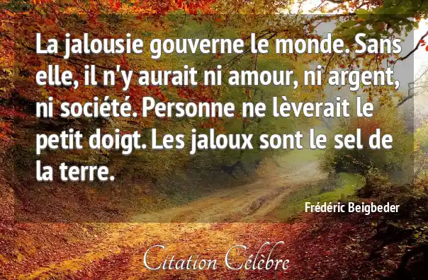 La jalousie gouverne le monde. Sans elle, il n'y aurait ni amour, ni argent, ni société. Personne ne lèverait le petit doigt. Les jaloux sont le sel de la terre.