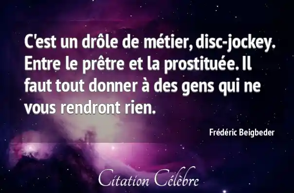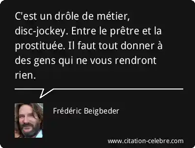 C'est un drôle de métier, disc-jockey. Entre le prêtre et la prostituée. Il faut tout donner à des gens qui ne vous rendront rien.