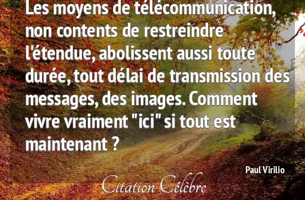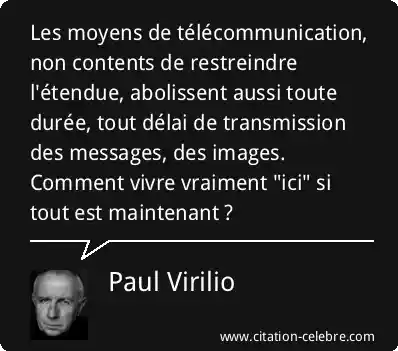 Les moyens de télécommunication, non contents de restreindre l'étendue, abolissent aussi toute durée, tout délai de transmission des messages, des images. Comment vivre vraiment "ici" si tout est maintenant ?