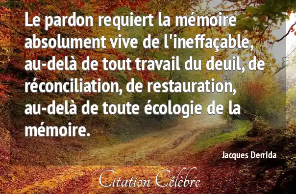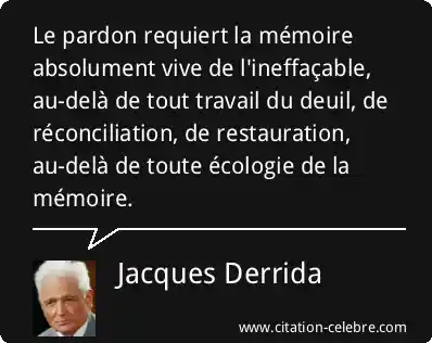 Le pardon requiert la mémoire absolument vive de l'ineffaçable, au-delà de tout travail du deuil, de réconciliation, de restauration, au-delà de toute écologie de la mémoire.