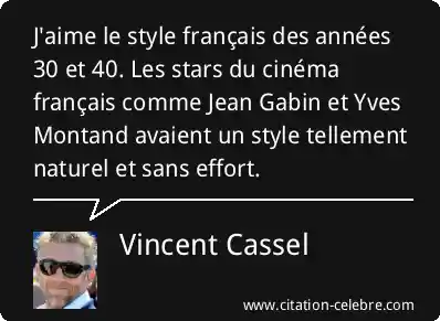 J'aime le style français des années 30 et 40. Les stars du cinéma français comme Jean Gabin et Yves Montand avaient un style tellement naturel et sans effort.