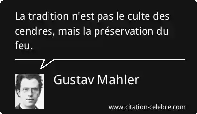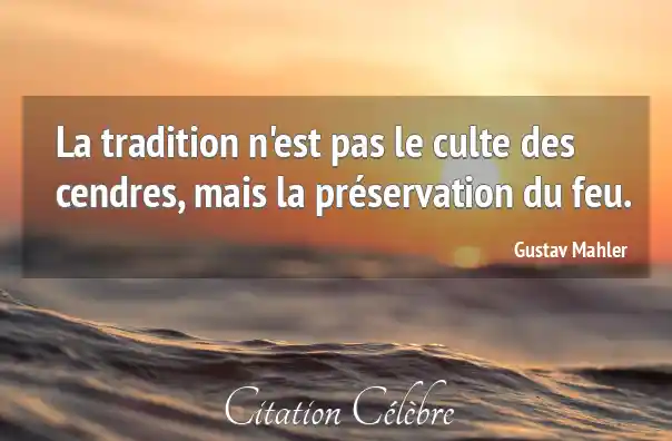 Cette citation, attribuée à Gustav Mahler, exprime une vision dynamique et vivante de la tradition. Elle soutient que la tradition n'est pas une simple vénération passive du passé (le « culte des cendres »), mais plutôt un effort actif et continu pour maintenir vivante l'essence créatrice, l'énergie et l'inspiration originelles (la « préservation du feu »).