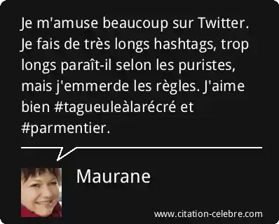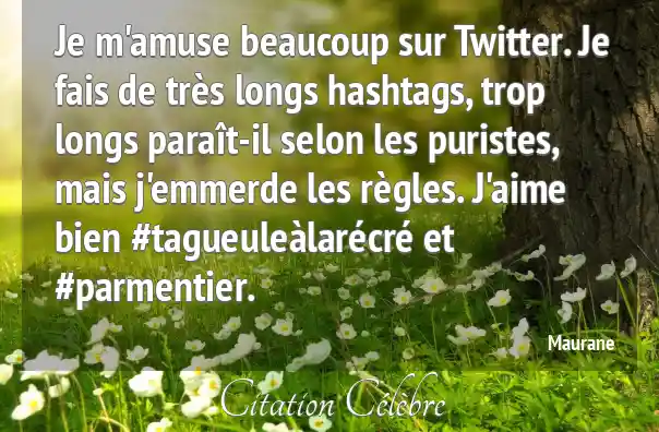 Je m'amuse beaucoup sur Twitter. Je fais de très longs hashtags, trop longs paraît-il selon les puristes, mais j'emmerde les règles. J'aime bien #tagueuleàlarécré et #parmentier.