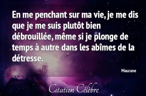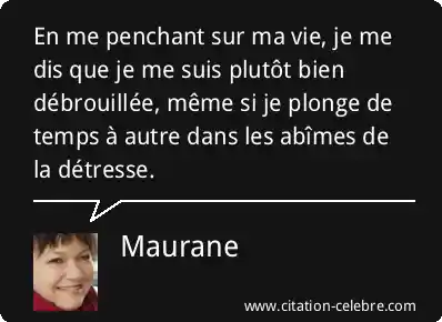 En me penchant sur ma vie, je me dis que je me suis plutôt bien débrouillée, même si je plonge de temps à autre dans les abîmes de la détresse.