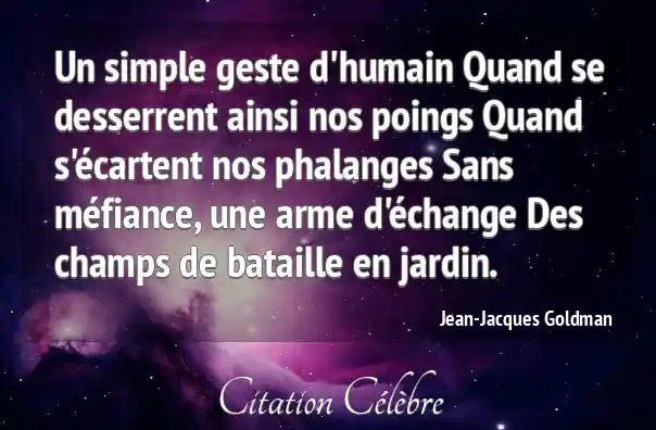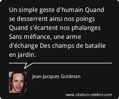 Un simple geste d'humain Quand se desserrent ainsi nos poings Quand s'écartent nos phalanges Sans méfiance, une arme d'échange Des champs de bataille en jardin.