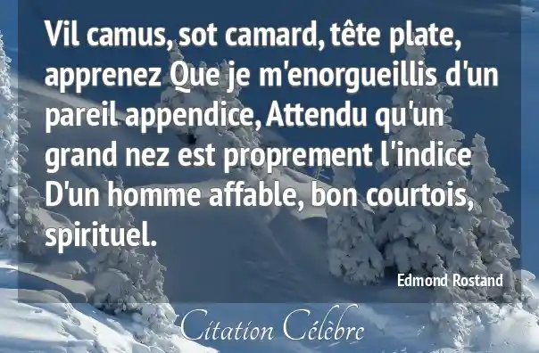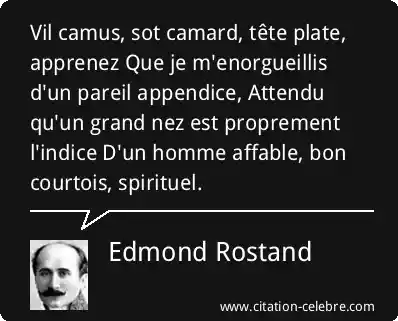 Vil camus, sot camard, tête plate, apprenez Que je m'enorgueillis d'un pareil appendice, Attendu qu'un grand nez est proprement l'indice D'un homme affable, bon courtois, spirituel.