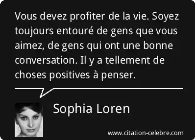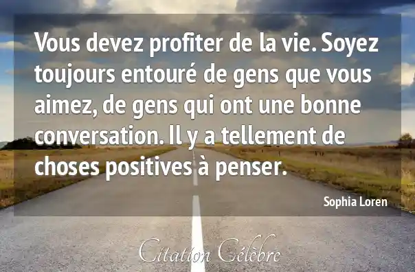 Vous devez profiter de la vie. Soyez toujours entouré de gens que vous aimez, de gens qui ont une bonne conversation. Il y a tellement de choses positives à penser.