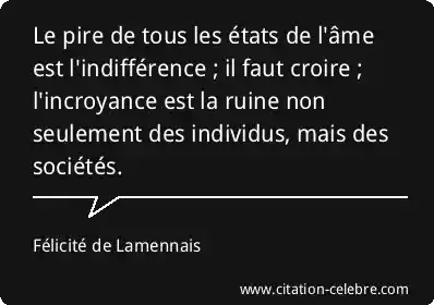 Le pire de tous les états de l'âme est l'indifférence ; il faut croire ; l'incroyance est la ruine non seulement des individus, mais des sociétés.