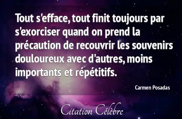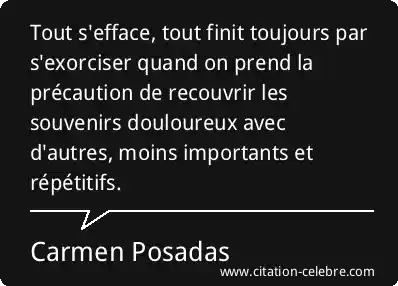 Tout s'efface, tout finit toujours par s'exorciser quand on prend la précaution de recouvrir les souvenirs douloureux avec d'autres, moins importants et répétitifs.