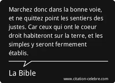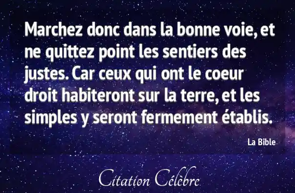 Marchez donc dans la bonne voie, et ne quittez point les sentiers des justes. Car ceux qui ont le coeur droit habiteront sur la terre, et les simples y seront fermement établis.