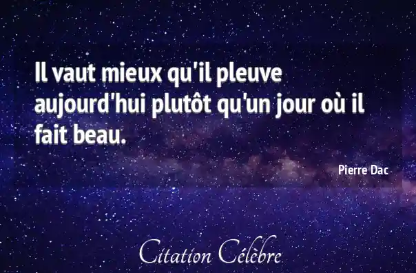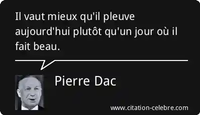 Cette citation de Pierre Dac est un exemple classique de son humour absurde et de sa logique par l'illogisme. Le sens premier est une affirmation qui, à première vue, semble évidente ou du moins anodine. Cependant, elle est intrinsèquement vide de sens pratique, car le temps qu'il fait n'a pas de meilleure ou de pire journée pour se manifester. La pluie "aujourd'hui" ne peut pas avoir lieu un jour où "il fait beau", et inversement.