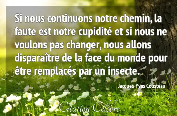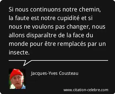 Si nous continuons notre chemin, la faute est notre cupidité et si nous ne voulons pas changer, nous allons disparaître de la face du monde pour être remplacés par un insecte.