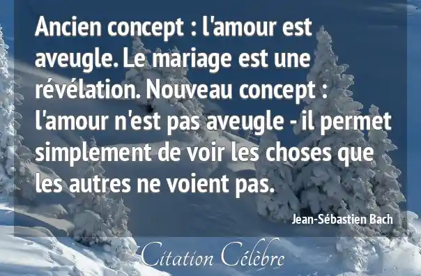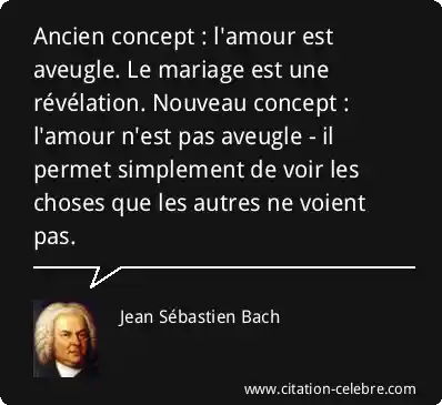 Ancien concept : l'amour est aveugle. Le mariage est une révélation. Nouveau concept : l'amour n'est pas aveugle - il permet simplement de voir les choses que les autres ne voient pas.