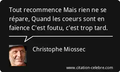 Tout recommence Mais rien ne se répare, Quand les coeurs sont en faïence C'est foutu, c'est trop tard.