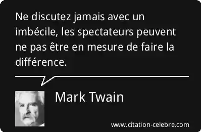 Cette célèbre citation de Mark Twain, "Ne discutez jamais avec un imbécile, les spectateurs peuvent ne pas être en mesure de faire la différence," signifie qu'en vous engageant dans un débat avec une personne peu intelligente ou déraisonnable, vous risquez d'abaisser votre propre niveau au sien. Par conséquent, aux yeux des observateurs extérieurs, votre propre crédibilité et votre sérieux pourraient être mis en doute. L'idée est que l'acte même de débattre avec un "imbécile" vous fait paraître tout aussi déraisonnable, car l'observateur ne voit que deux personnes se disputant, sans pouvoir discerner lequel des arguments est le plus fondé ou pertinent.
