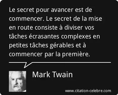 Le secret pour avancer est de commencer. Le secret de la mise en route consiste à diviser vos tâches écrasantes complexes en petites tâches gérables et à commencer par la première.