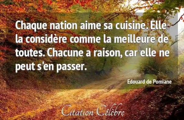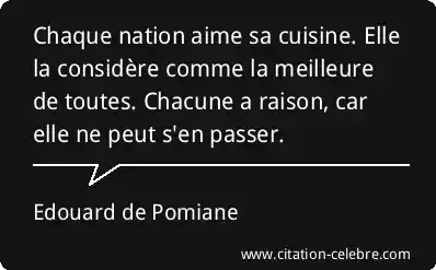 Chaque nation aime sa cuisine. Elle la considère comme la meilleure de toutes. Chacune a raison, car elle ne peut s'en passer.