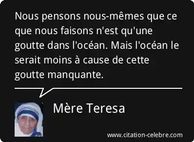 Nous pensons nous-mêmes que ce que nous faisons n'est qu'une goutte dans l'océan. Mais l'océan le serait moins à cause de cette goutte manquante.