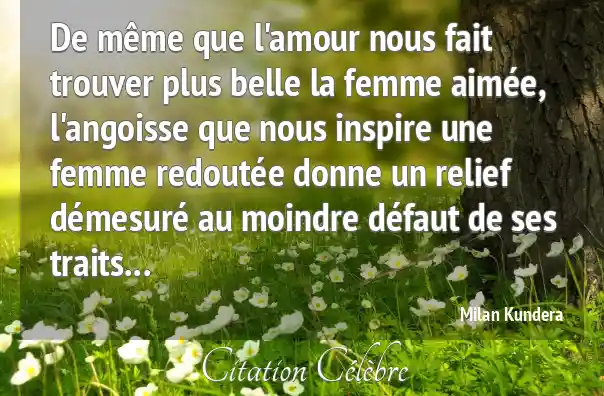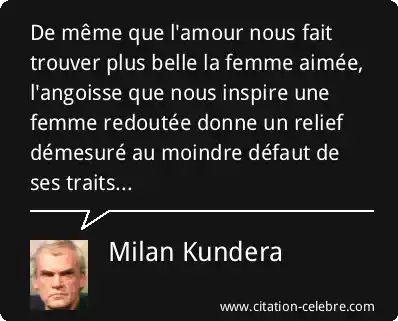De même que l'amour nous fait trouver plus belle la femme aimée, l'angoisse que nous inspire une femme redoutée donne un relief démesuré au moindre défaut de ses traits...