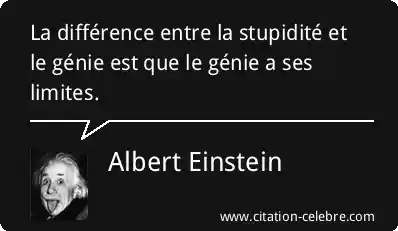 Cette célèbre citation attribuée à Albert Einstein joue sur l'idée paradoxale que la stupidité pourrait être considérée comme virtuellement illimitée, tandis que le génie, même dans sa plus grande expression, est intrinsèquement borné. Elle suggère que l'ignorance ou la bêtise n'ont pas de limites clairement définies, pouvant s'étendre à l'infini, alors que l'intelligence et la créativité, aussi grandes soient-elles, opèrent toujours dans un cadre et atteignent un point maximal.