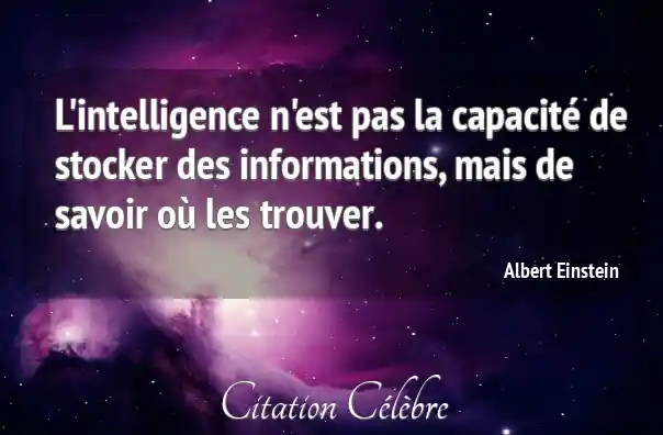 Cette célèbre formule d'Albert Einstein remet en question la définition traditionnelle de l'intelligence. Elle suggère que l'intelligence véritable ne réside pas dans la simple mémorisation ou le "stockage" d'un grand nombre de faits, de données ou de connaissances brutes. Au contraire, elle est la capacité à savoir comment et où accéder à l'information pertinente lorsque l'on en a besoin. C'est l'art de la recherche efficace, du tri et de la mise en relation des connaissances.