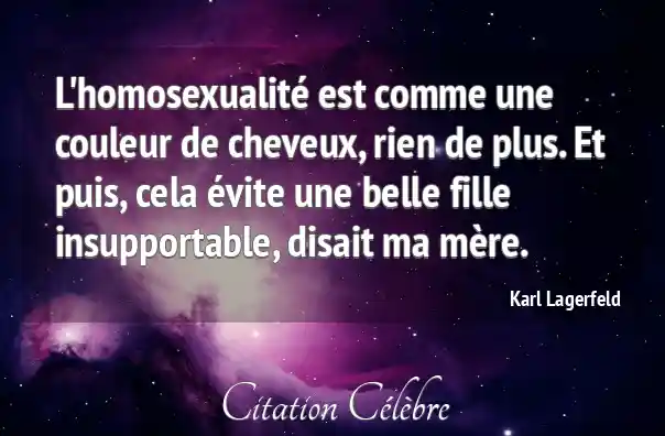 L'homosexualité est comme une couleur de cheveux, rien de plus. Et puis, cela évite une belle fille insupportable, disait ma mère.