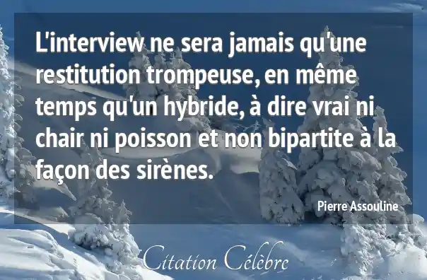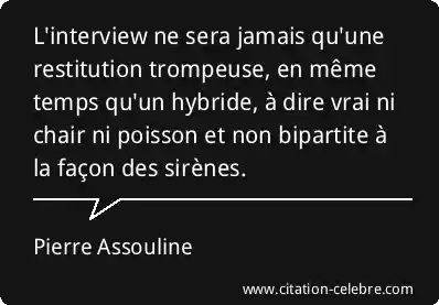 L'interview ne sera jamais qu'une restitution trompeuse, en même temps qu'un hybride, à dire vrai ni chair ni poisson et non bipartite à la façon des sirènes.