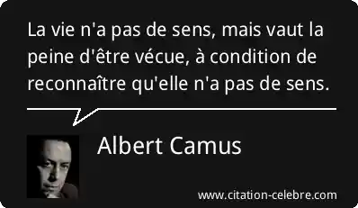 Cette célèbre formule d'Albert Camus exprime l'idée centrale de la philosophie de l'absurde. Elle signifie que l'existence humaine n'est pas prédéterminée par un but ou une signification universelle (la vie « n'a pas de sens »). Cependant, au lieu d'être une raison de désespérer, cette absence de sens est paradoxalement la condition même pour que la vie puisse être appréciée et vécue pleinement (« vaut la peine d'être vécue »). La condition essentielle est l'honnêteté intellectuelle d'admettre cet absurde.