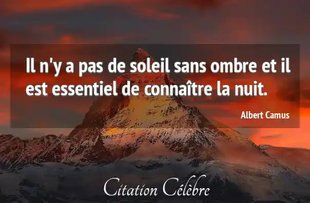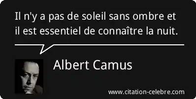 Cette puissante citation d'Albert Camus exprime l'idée que l'existence est intrinsèquement faite de dualités. Elle signifie qu'on ne peut pas connaître ou apprécier la lumière (le bonheur, la joie, la réussite) sans avoir fait l'expérience de l'ombre (la souffrance, la tristesse, l'échec). Le jour et la nuit, le soleil et l'ombre, sont des opposés nécessaires et interdépendants. L'obscurité n'est pas seulement l'absence de lumière, mais une étape essentielle pour comprendre et valoriser ce qu'est la clarté.
