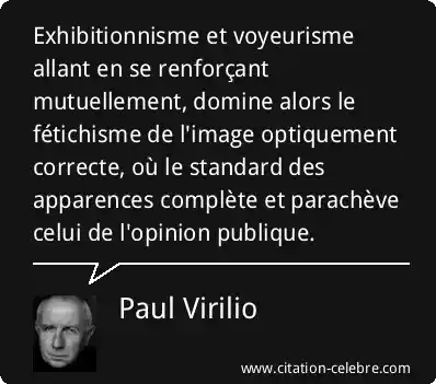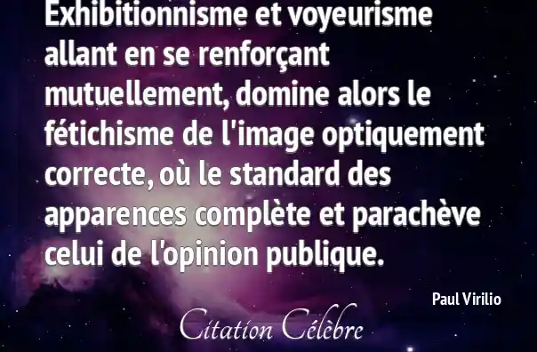 Exhibitionnisme et voyeurisme allant en se renforçant mutuellement, domine alors le fétichisme de l'image optiquement correcte, où le standard des apparences complète et parachève celui de l'opinion publique.