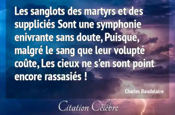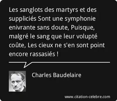 Les sanglots des martyrs et des suppliciés Sont une symphonie enivrante sans doute, Puisque, malgré le sang que leur volupté coûte, Les cieux ne s'en sont point encore rassasiés !