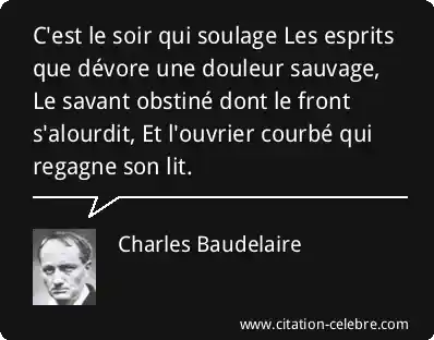 C'est le soir qui soulage Les esprits que dévore une douleur sauvage, Le savant obstiné dont le front s'alourdit, Et l'ouvrier courbé qui regagne son lit.