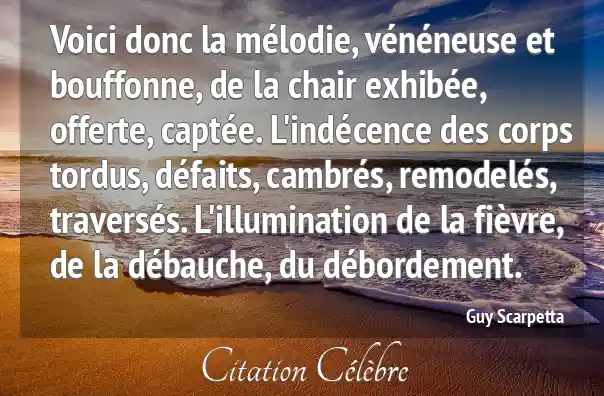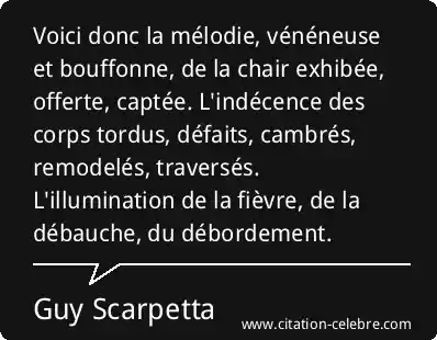 Voici donc la mélodie, vénéneuse et bouffonne, de la chair exhibée, offerte, captée. L'indécence des corps tordus, défaits, cambrés, remodelés, traversés. L'illumination de la fièvre, de la débauche, du débordement.