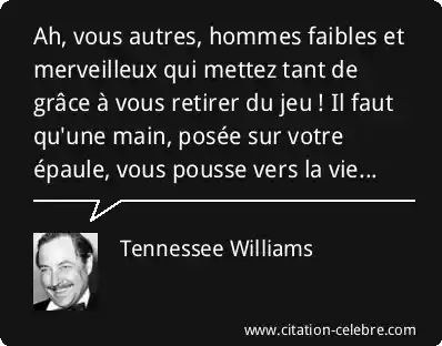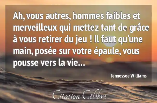 Ah, vous autres, hommes faibles et merveilleux qui mettez tant de grâce à vous retirer du jeu ! Il faut qu'une main, posée sur votre épaule, vous pousse vers la vie...